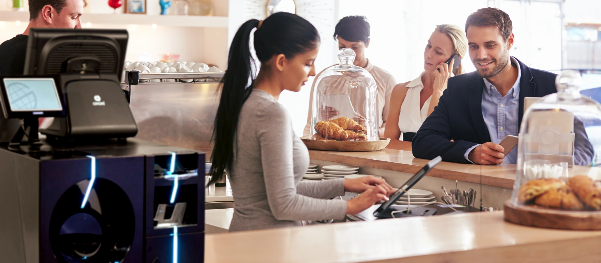 Solución destinada a establecimientos de cara al público para optimizar tiempos en los cobros a sus clientes: panaderías, fruterías, pescaderías, restauración, tiendas retail, etc.